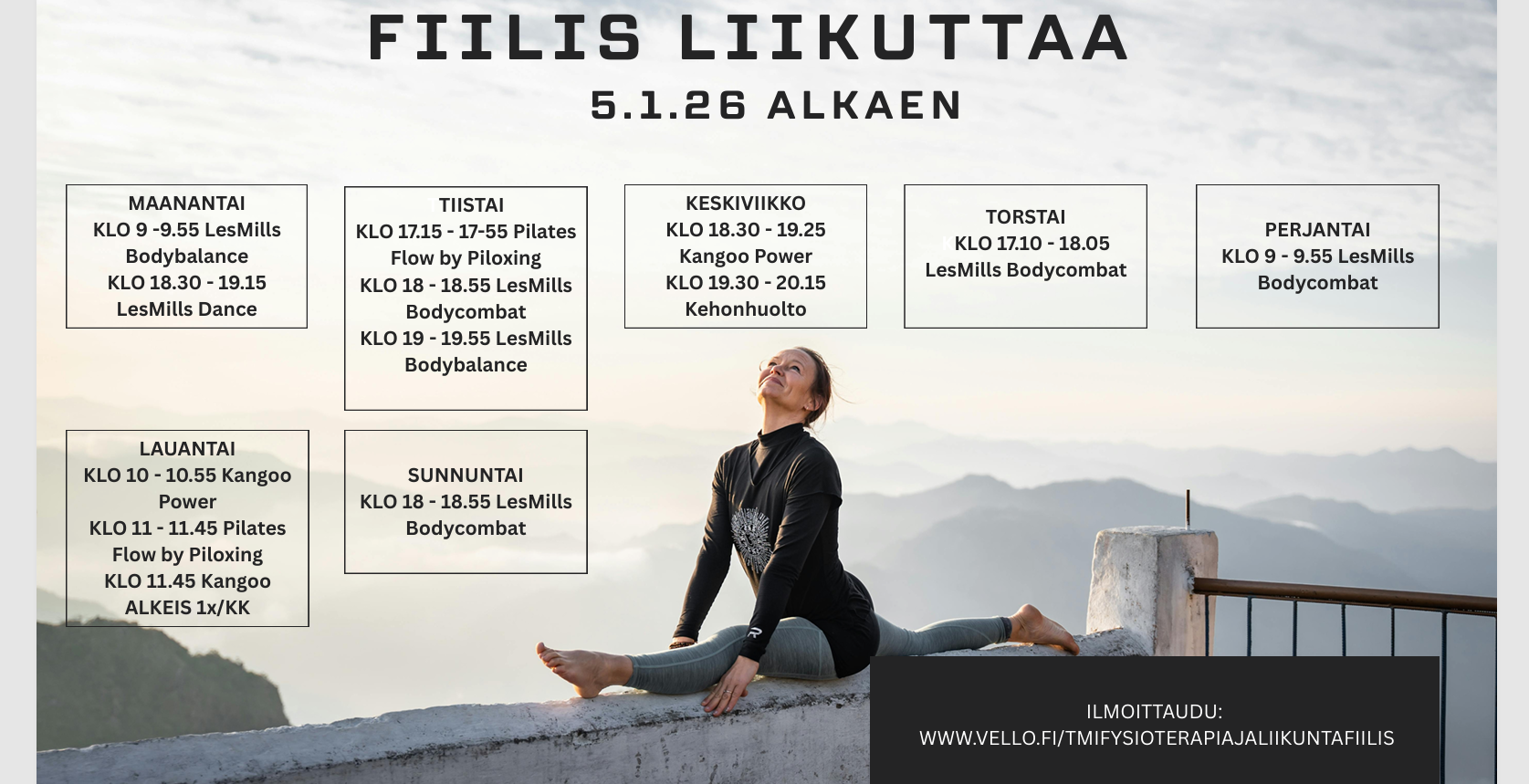 Ajantasaiset ja toteutuvat tunnit löydät osoitteesta www.vello.fi/tmifysioterapiajaliikuntafiilis
